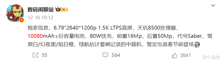 对续航很介意的一又友总共不错再等等,岁首就能看到多款10000mAh容量的手机,荣耀x80系列应该也会上万级大电板,另外真我在岁首也会发布万级电板手机,致使还在量产12000mAh手机、测试15000mAh手机了,到来岁估量7000mAh、8000mAh皆算小的了,行业一朝卷了电板,这发展速率确乎很快,一又友们不错期待期待。