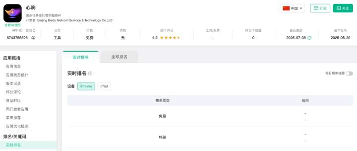然则,与蝴蝶效应被成本追捧形成截然反差,百度心响已无东谈主问津。七麦数据炫耀,在App Store,心响App近30日下载量为零。2025年7月后,该产物再未更新。