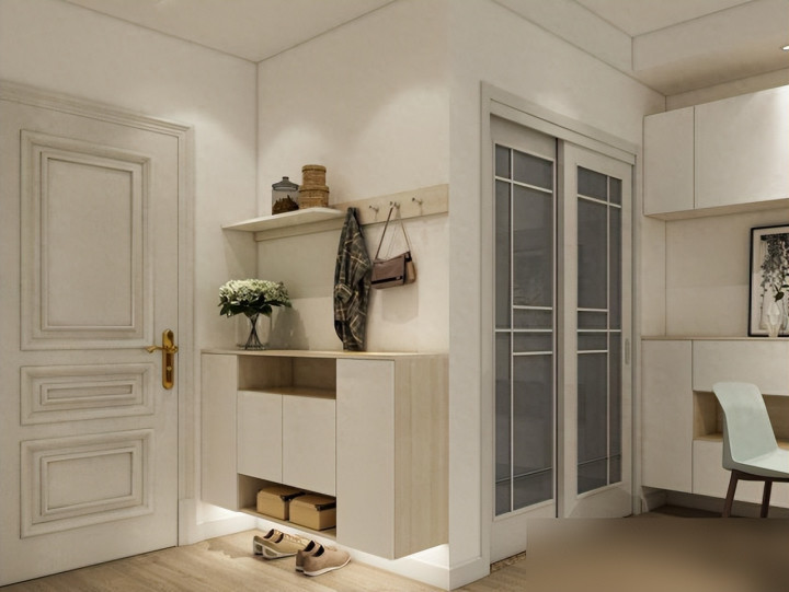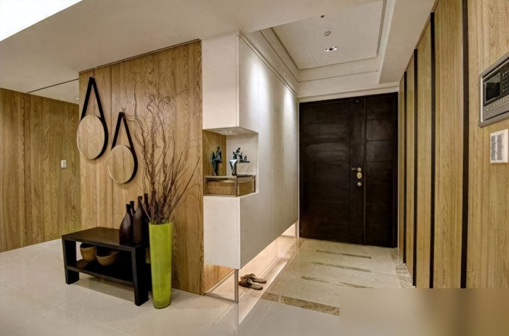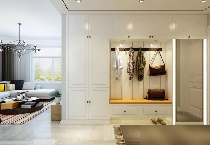 藏是指秘密保护,幸免开门就被瞧光客厅全貌;收是储物功能,通顶柜子能多装几十双鞋,墙面挂钩挂次日要穿的外衣;亮是采光持重,筒灯射灯齐得安排上,尤其小户型千万别用深色柜子挡色泽。